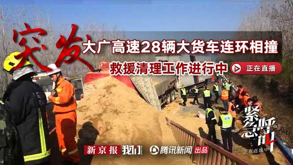 新京报讯(记者 张彤 雷燕超)今日(20日)8时许,平舆县委宣传部发布通报称,11月19日7时23分至7时45分,在大广高速平舆县杨埠收费站南2148公里-2149公里处,由南去往周口方向,发生三起货车追尾事故。截止目前,事故共造成9人死亡,9人受伤(目前生命体征稳定)。