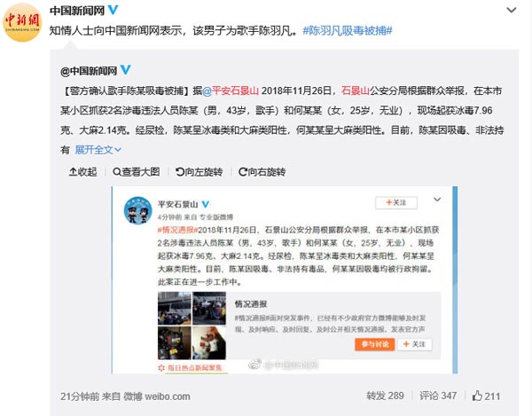 此前,网友在微博爆料称陈羽凡已经因吸毒被抓。