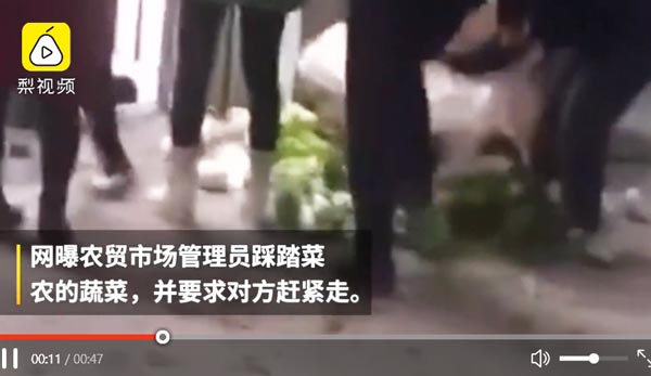 11月26日,云南绥江县。农贸市场管理员踩踏菜农蔬菜的视频在网上热传。当地城管局发布通报,称菜农占道经营且不听管理员安排,旁边的商贩煽风点火致管理员行为过激。目前管理员被停职,并向菜农道歉赔偿其损失。