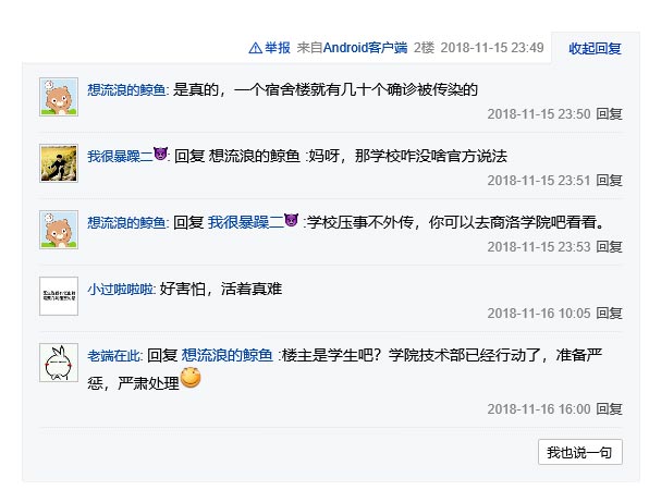 这名学生说,在学校贴吧“商洛学院吧”里学生曾发帖表示过对疫情的担忧。