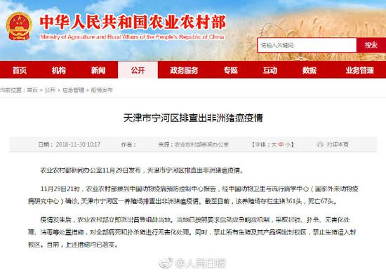 【天津市宁河区排查出非洲猪瘟疫情】11月29日21时,农业农村部接到报告,天津市宁河区一养殖场排查出非洲猪瘟疫情。截至目前,该养殖场存栏生猪361头,死亡67头。疫情发生后,当地已按照要求启动应急响应机制,采取封锁、扑杀、无害化处理、消毒等处置措施,对全部病死和扑杀猪进行无害化处理。