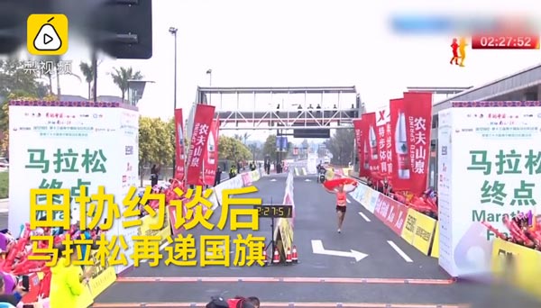 今天上午南宁马拉松开跑,程乾育夺得中国男子全程冠军。前段时间马拉松“递国旗”事件曾受到田协约谈,不过组委会依旧安排工作人员在终点冲刺赛段路边递送国旗。由于选手的配合,递交国旗的动作并未影响选手的成绩。