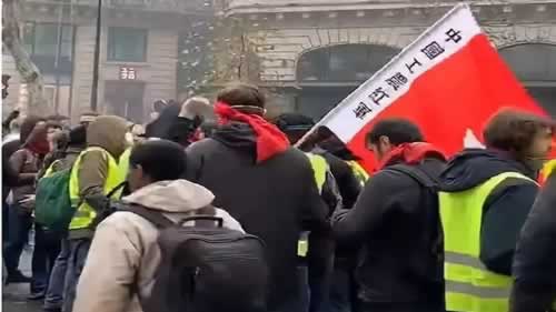 不过,安静地在街上行走,仍然是黄背心运动的主流场景。在这些场景中,有一个镜头让中国网民格外关注:一面醒目的旗帜飘扬在黄背心运动的参与者中,上面有六个汉字:“中国工农红军”。