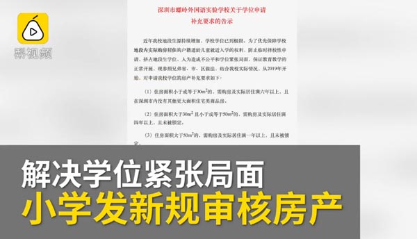 12月4日,深圳罗湖区一小学发布学位申请补充要求告示,表示为解决学位紧张局面,将对申请学位的房产进行审核。罗湖区教育局告诉@梨视频,该补充条例是学校根据自己招生的实际情况拟定的,是学校行为。
