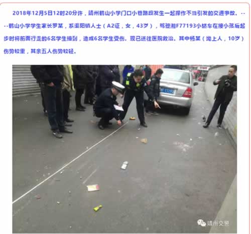 据湖南靖州交警官方微信消息,2018年12月5日12时20分许,靖州鹤山小学门口小巷路段发生一起操作不当引发的交通事故。----鹤山小学学生家长罗某,系渠阳镇人士(A2证,女,43岁),驾驶湘F77193小轿车在接小孩后起步时将前面行走的6名学生撞到,造成6名学生受伤。现已送往医院救治。其中杨某(坳上人,10岁)伤势较重,其余五人伤势较轻。