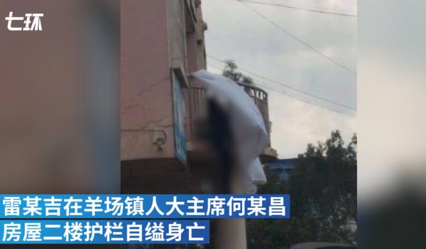 12月9日,云南宣威。雷某吉到羊场镇人大主席房屋二楼护栏自缢身亡。11日市政府通报称其系自杀,曾因违建问题与镇政府产生矛盾。市委宣传部人员称,双方已签处置协议。