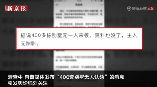 在对别墅的清查中,有自媒体发布称,其中“400套别墅无人认领”,消息发布后引发舆论强烈关注。