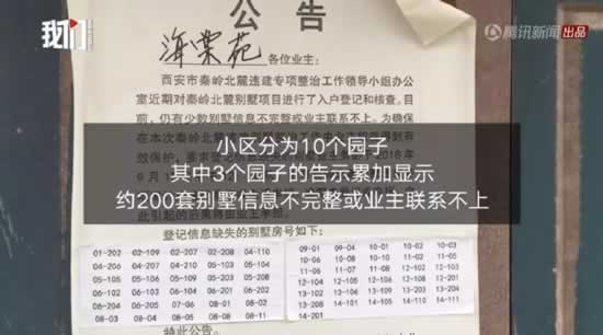 9月22日,西安市秦岭北麓违建专项整治工作领导小组办公室通过“西安发布”登出了一组多栋别墅的照片。相关通告中称:各有关业主,近期,西安市秦岭北麓违建专项整治工作领导小组办公室对秦岭北麓别墅项目进行了入户登记和核查,经过多方努力,仍有极个别业主无法取得联系。