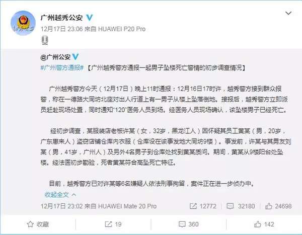 12月17日,广州越秀公安通报了一起引人关注的坠楼事件。
