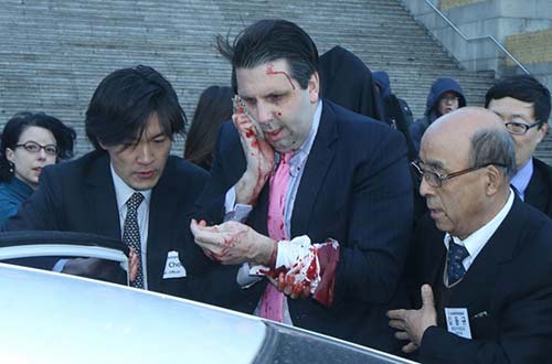 图:美国驻韩大使李柏特(中)5日手捂着受伤的脸\法新社