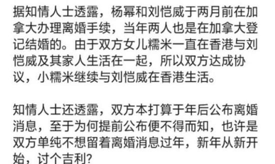 但近日有知情人士透露,杨幂和刘恺威已经在两个月前正式办理了离婚手续,地点则是加拿大,因为当年两人也是在加拿大举行的婚礼。由于小糯米一直在香港与刘恺威及其家人生活在一起,所以双方也达成了协议,小糯米继续与刘恺威在香港生活。