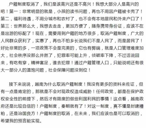 接下来说说,越南为什么取消户籍制度!我没有更多的资料来佐证,但有一点是肯定的,那就是不会对现政权造成威胁!任何政党,都是在保护政权安全性的前提下,然后才有限度的做些利国利民的事情!这点看,越南政府还是比较自信的!户籍制度,秦朝就有了!对这一制度,真不懂是封建糟粕,还是治国良方!户籍制度的取消,在未来,我们应该也是可以取消的,希望我的预言能实现。
