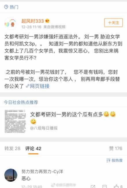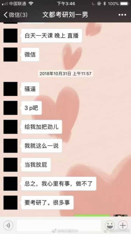 日前,网友“起风时333”在网上发帖爆料,称自己是一名考研的学生,和名为“文都考研”的刘一男老师存在两性关系,并称2017年就开始跟着刘老师上课,在交往过程中发现刘胁迫其他女学员淫乱,而且隐瞒自己有家室的情况,与多名女生有染。