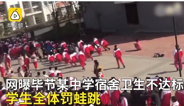 1月3日贵州毕节,网曝毕节一中学学生因寝室卫生不达标遭罚集体蛙跳,引部分学生不满。宿舍管理科回应:是新来的宿管,管理方式过激,但领导都及时制止了。学生蛙跳也没跳多远,过一会儿就用走的了,网上都是谣言。