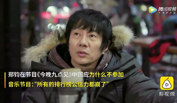 郑钧在节目《今晚九点见》中回应为什么不参加音乐节目:“所有的排行榜公信力都崩了,现在上面的歌十首有九首听不进去。原来的排行榜歌有自己的生命力,现在因为这个人很火,歌就火。”