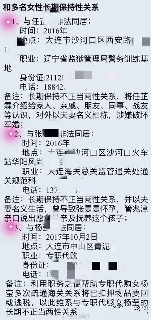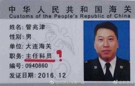 管兆津,2016年从武警沈阳支队副连职岗位转业到地方,任大连海关监管通关处查验管理科主任科员(入关职级不符合规定),在婚内长期与多名女性保持不正当性关系。举报人在调查过程中,发现管兆津利用职务便利与他人勾结,虚增采购商品价值,骗取采购经费,谋取私利;伙同其他关员,包庇纵容走私,帮助多任海关领导及多名专职代购多次逃避海关查验,进行逃税、漏税,数额巨大。具体内容如下: