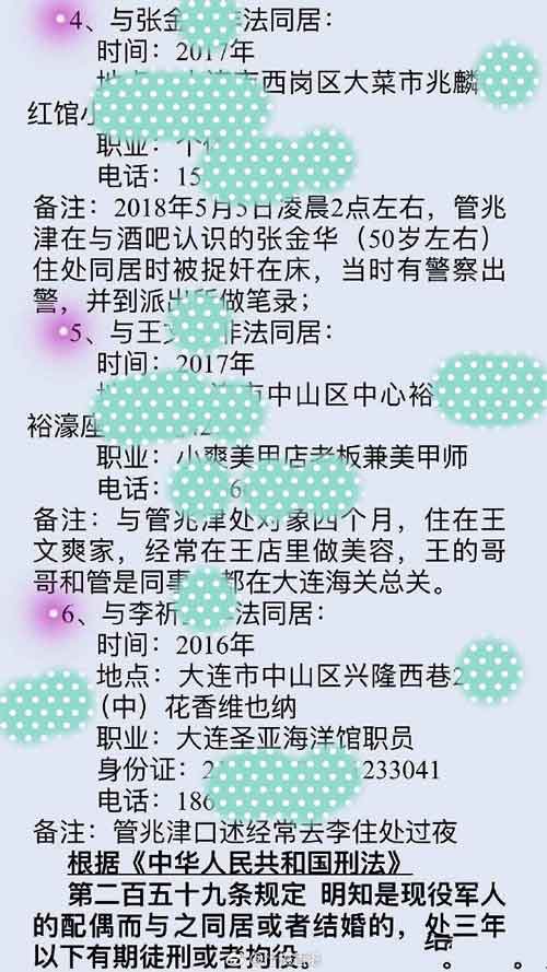 我是现役军人,也是管兆津的合法妻子,管兆津婚内出轨,长期与十多名女性非法同居或发生性关系,破坏军婚;