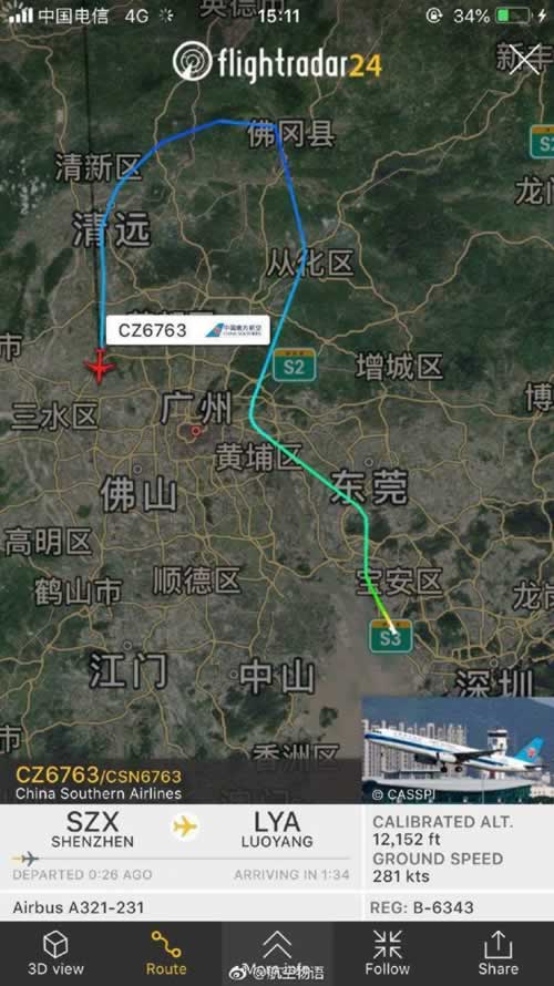 1月9日下午,知名航空博主航空物语发布消息称,中国南方航空CZ6763(深圳-洛阳)(备注:此航班经停洛阳),起飞后出现通讯失效故障,现正返航。经查询,1月9日下14:42,该航班于深圳宝安国际机场起飞。刚刚南都记者了解到,CZ6763/B6343已于15:30安全落地深圳,停机位89#。