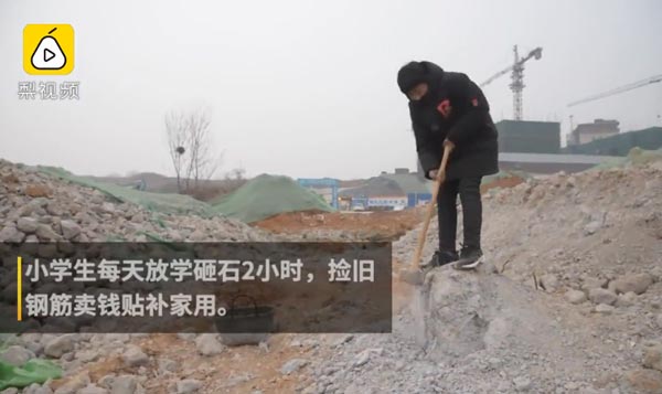 实拍河南12岁男孩放学后砸石捡钢筋攒钱办年货现场视频