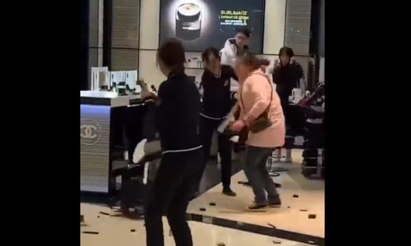 实拍青岛万象城女子狂砸香奈儿专柜导购衣服被扯险走光现场视频