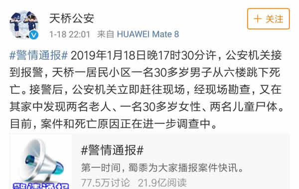 据济南市公安局天桥区分局官方微博消息,1月18日17时30分许,公安机关接到报警,天桥一居民小区一名30多岁男子从六楼跳下死亡。接警后,公安机关立即赶往现场,经现场勘查,又在其家中发现两名老人、一名30多岁女性、两名儿童尸体。
