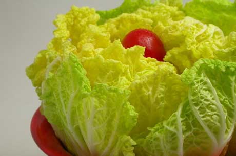 白菜是大众菜。它性微寒,味甘,具有解毒除热。通利肠胃的功能。凡心烦口渴,大便不畅,小便黄少者均可常食白菜。白菜中含有较多粗纤维,还含有维生素A,B,C,尤以维生素C较多,白菜中的纤维素可以促进肠壁的蠕动,帮助消化,防止大便干燥。生吃白菜心可以不破坏白菜的营养,通便很有效。每次吃白菜心半斤。每当感到有大便,但是便不出来时,边吃白菜边喝水,很快能便出来。
