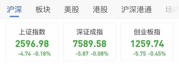 全天,A股高开低走。截至收盘,沪指收报2596.98点,跌幅0.18%;深成指收报7589.58点,跌幅0.08%;创业板指收报1259.74点,跌幅0.45%。