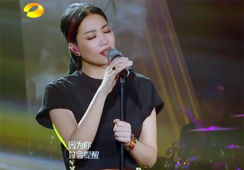 第五位登场的黄丽玲身着黑色短裙,姣好身材展露无遗,挑染中分长发配上精致妆容,于成熟干练中显得简单大气。一句“你还记得吗”一出口,醇厚的中低音便已攫取全场观众的听觉神经,低沉的小提琴配上钢琴的清脆乐声,配上黄丽玲醇厚的音色和缱绻转音,似在诉说一个缠绵低沉的爱情故事。