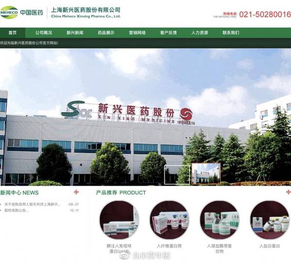 据上海新兴医药股份有限公司官方网站介绍,该系国家血液制品定点生产企业,主要从事血液制品的生产和销售,是一个集科研、生产、销售为一体的高科技外向型生物医药企业。“公司成立于2000年8月,由中国新兴(集团)总公司等单位共同发起,注册资本1.64亿元,于2009年随新兴集团整体重组并入中国通用技术集团。现由中国医药健康产业股份有限公司(中国医药600056)控股管理。”北青报记者注意到,在该公司官网产品推荐一栏, 静注人免疫球蛋白(pH4)位列第一。产品介绍显示,该产品适应症主要为:急性炎症、血小板减少、川崎病、控制化疗感染等。