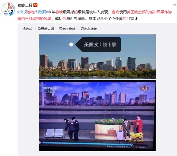 据知名博主@秦岭二月:#央视春晚大数据#今年春晚最震撼的爆料是被牛人发现,春晚使用美国波士顿的城市风景作为国内三线城市的风景,成功的与世界接轨。其实只是少了个外国的月亮🌙 。