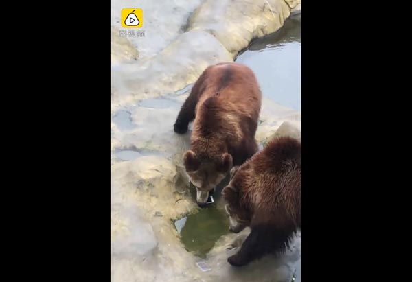 实拍常州一游客喂棕熊误把iPhone手机当苹果喂熊现场视频