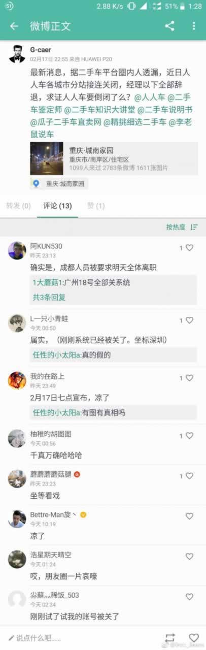 2月18日消息,有微博网友爆料称人人车各城市分站相继关闭,经理以下全部辞退。