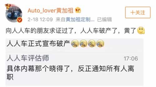 而微博认证为“资深汽车达人 汽车视频自媒体”的网友发微博称“向人人车的朋友求正过了,人人车破产了,黄了。“