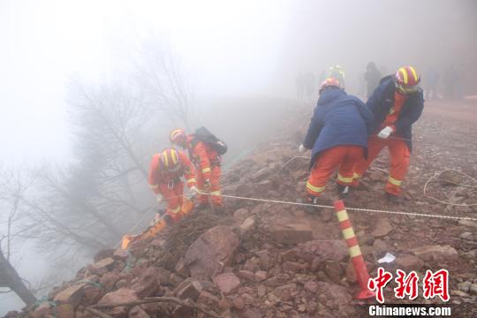 由于山崖坡度最陡处接近80度,当时天气又有大雾,能见度不足50米,救援难度相当大,救援人员利用绳索绑在消防车车头牵引器上,然后沿着绳索和携带多功能担架下到距离路面100多米的山崖附近进行救援;第二组救援人员在山崖上方利用抢险救援消防车的牵引绳将遇难人员拉上路面。