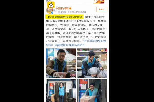 2月27日,浙江杭州。据媒体报道,46岁的江贤俊曾是杭州某大学副教授,教了25年英语,2017年却转行做起了快递。他称自己上课时,绝大多数学生都在睡觉玩手机。做快递虽忙碌,但却得到了大家的尊重。