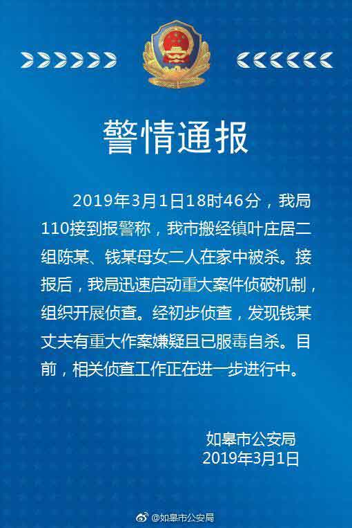2019年3月1日18时46分,我局110接到报警称,我市搬经镇叶庄居二组陈某、钱某母女一人在家中被杀。接报后,我局迅速启动山大案件侦破机制,组织开展侦查。经初步侦查,发现钱某丈夫有重大作案嫌疑且已服毒自杀。目前,相关侦查工作正在进一步进行中。
