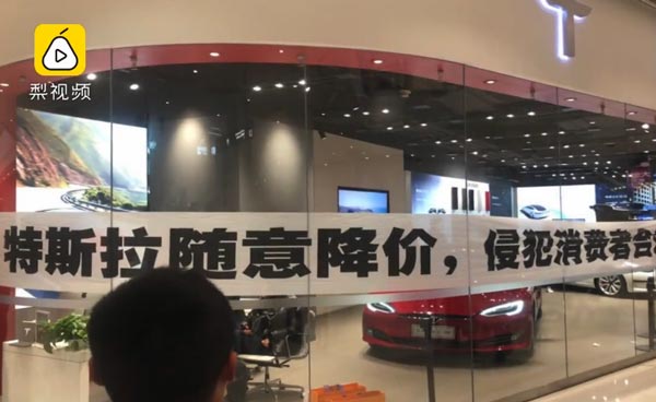 实拍特斯拉突然降价17万车主拉横幅讨说法现场视频