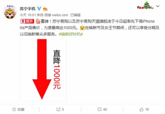 3月5日下午,苏宁手机官方微博表示,苏宁易购以及苏宁易购天猫旗舰店于今日(3月5日)起率先下调iPhone XS产品售价,力度最高达1000元。