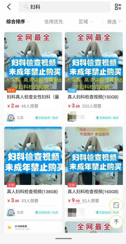 3月7日上午,记者在闲鱼平台搜索关键词“妇科”,页面出现大量“真人妇科检查视频”的商品,价格多在10元以下,还特别标注“未成年人禁止购=买”。其中一相关商品被拍下200余次。