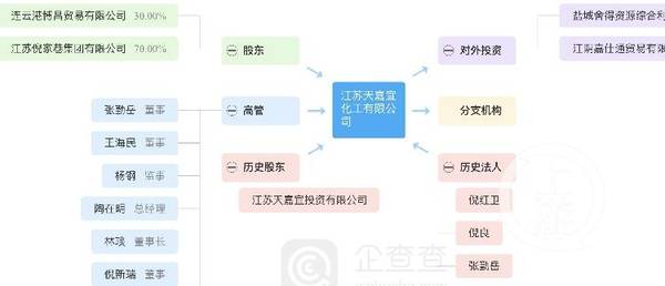 工商资料显示,江苏天嘉宜化工有限公司拥有者分别为:江苏倪家巷集团有限公司(简称倪家巷集团)和连云港博昌贸易有限公司,持股比例分别为70%和30%。其企业高管有7人,分别是董事长林琰、总经理陶在明、董事倪新瑞、董事王海民、董事张勤岳、董事赵红雨、监事杨钢。