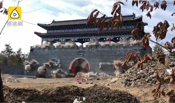 实拍牡丹江曹园大门被爆破拆除现场视频
