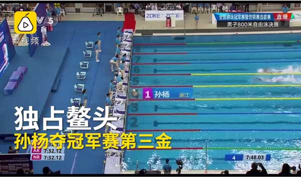 实拍孙杨勇夺第三金现场视频