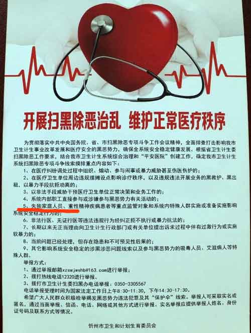 前述文章末尾附有扫黑除恶告示的照片。其中一张告示就是前述文章的内容,并留有忻州市卫计委扫黑办的电话。