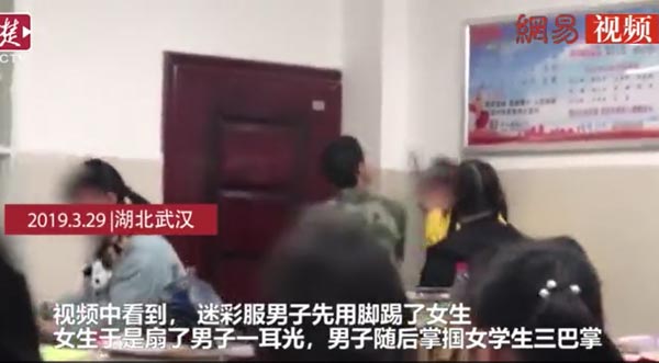 楚天都市报记者在一段视频中看到,一名身穿迷彩服的男子和一名女学生在教室里讲话,随后双方发生口角,迷彩服男子先用脚踢了女生,女生于是扇了男子一耳光,男子随后掌掴女学生三巴掌。