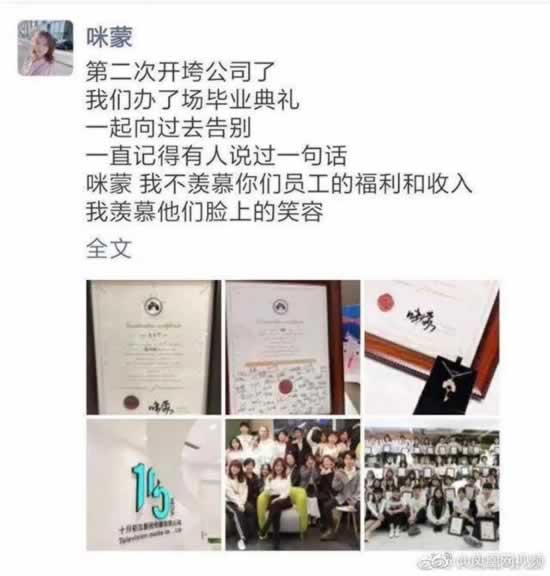 3月30日晚,咪蒙在朋友圈公布自己名下公司——北京十月初五影视传媒有限公司正式解散,并在朋友圈晒出了员工们都收到的一份特殊的“毕业证”。