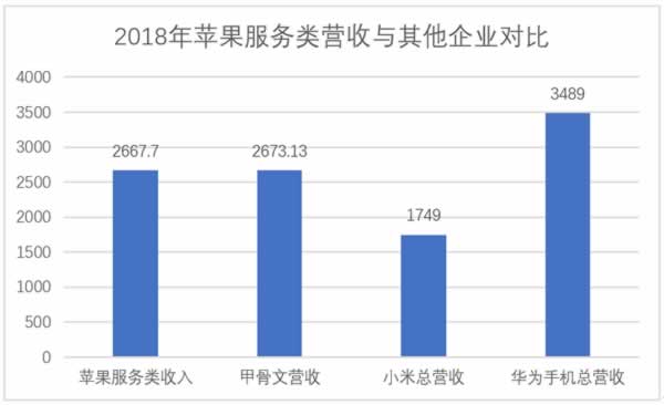 我们再用国内厂商的营收来对照一下,2018年小米总营收1749亿元人民币,华为消费者业务(包括手机、平板等业务,下简称为华为手机)营收为3489亿元人民币。OV兄弟不是上市公司,也未正式对外发布过财报,按销量和平均客单价来推测,估计营收与小米一个量级(小米的产品线较长,但OV的客单价较高)。苹果仅服务收入,就相当于1.52个小米,或0.76个华为手机。