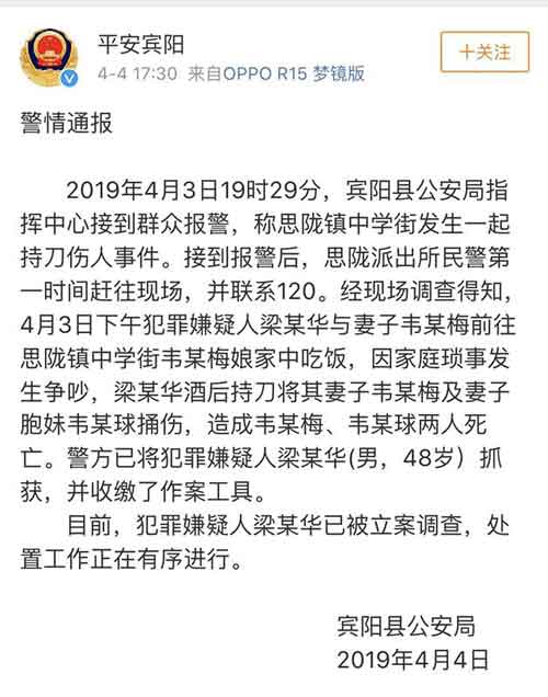 接到报警后,思陇派出所民警第一时间赶往现场,并联系120。经现场调查得知,4月3日下午犯罪嫌疑人梁某华与妻子韦某梅前往思陇镇中学街韦某梅娘家中吃饭,因家庭琐事发生争吵,梁某华酒后持刀将其妻子韦某梅及妻子胞妹韦某球捅伤,造成韦某梅、韦某球两人死亡。警方已将犯罪嫌疑人梁某华(男,48岁)抓获,并收缴了作案工具。