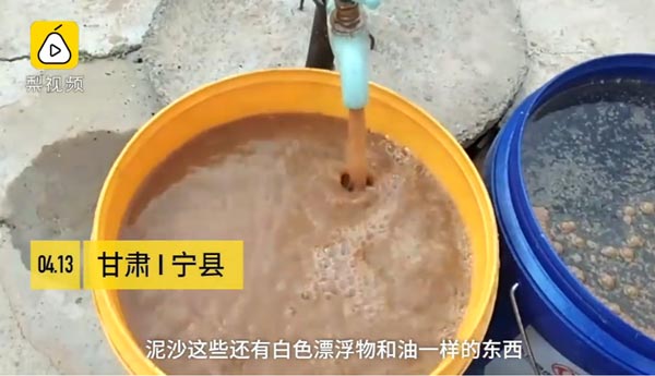 4月13日,甘肃宁县两个村子的自来水都浑浊发黄,甚至有油污。村民称,就这样这个水还经常停水,没有水只能用这个水,都不知道怎么办才好。村干部称,水浑浊是因为用水量太大没过滤,已向上级部门反映。