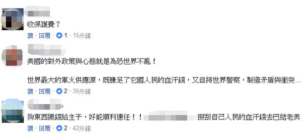 但美国这种说法,台湾网友并不买账,直言美国这是在“吸血”,“催缴保护费”,同时痛骂台湾当局“甘当被宰肥羊”“搜刮台湾人民的血汗钱去巴结美国”。