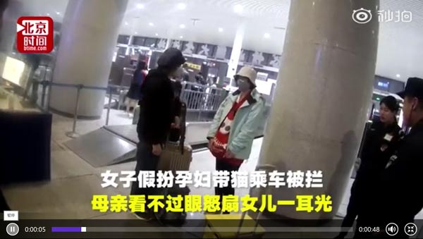 实拍女子将猫藏衣服扮孕妇乘火车被拦母亲怒扇其耳光现场视频